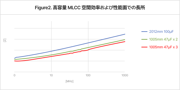 ▷ 下記 [Figure 2] のように 2012mm, 100㎌ MLCC 1 個の実装面積に 1005mm, 47㎌ (CL05X476MS8N9W#) MLCC を 3 個適用した場合、実装面積が減少すると同時に ESL 特性も改善されます。