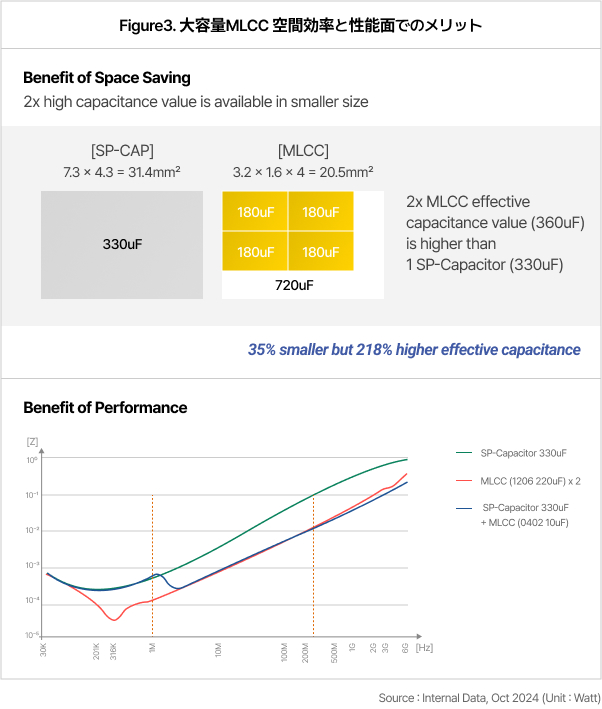 ▷ また、AIサーバーに大容量MLCCを採用することで、セット実装の観点から部品数を減らし、PCB設計をシンプル化させ実装面積空間の効率を向上させるメリットがあります。たとえば、以下の Figure 3のようにSP-CAP(330uF)1個の面積に4つのMLCC (180uF x 4@1Vdc) 機種を適用することで約35%の空間削減が可能となり、容量は218%改善できる効果を得られます。さらに、インピーダンス特性もSP-CAPより90%向上します。[Figure 3]