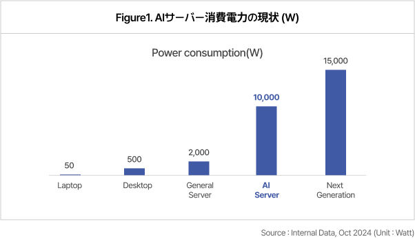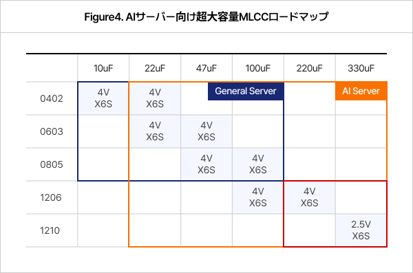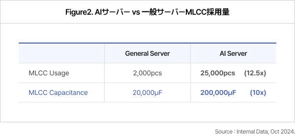 ▷ AIサーバーのパワー電力は、一般サーバーの5倍が消費され、MLCCは一般サーバーより12.5倍多く採用されています。[Figure 1, 2] AIサーバーに適用されるMLCCは、高電力に対応するため、大容量・高電圧・小型化が必要であり、このようなニーズは継続的に増加しています。
