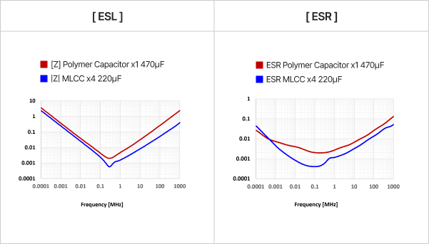 The capability to correct voltage immediately is crucial, since AI GPUs go through very large, instantaneous power fluctuations. MLCCs have a very low internal ESR (equivalent series resistance) and ESL (equivalent series inductance), minimizing voltage drop and enabling a rapid recovery, thus providing a faster and more stable voltage response than Aluminum Polymer Capacitors. They are also suited for AI server power architectures, since they maintain a low impedance in the high-frequency band (1–2 MHz).