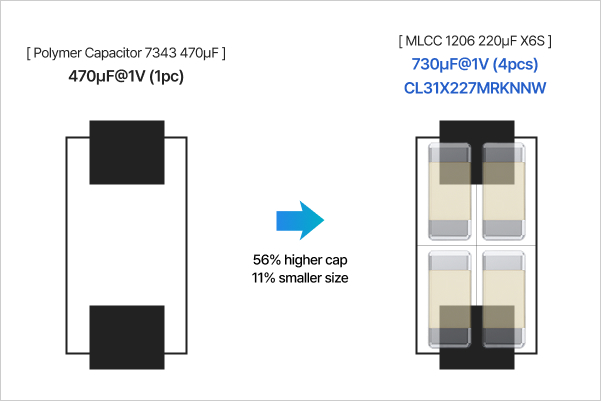 MLCCs are of a smaller size and lower height in comparison to Aluminum Polymer Capacitors. Using multiple MLCCs within the same area can lead to higher capacitance, improving space utilization efficiency greatly.