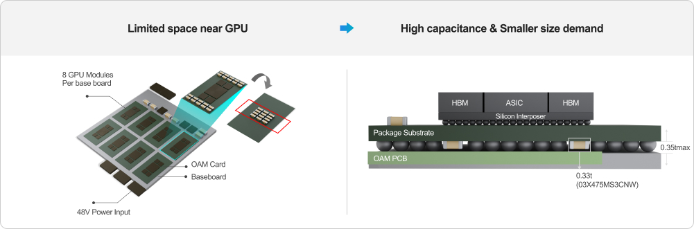 MLCCs placed near high-performance computing board GPUs and CPUs play a decoupling role to mitigate rapid current changes. As the performance of chips advance, the mounting area is reduced, whilst the required capacitance grows. Thus, “ultra-small high-capacitance” technology is the epicenter- which includes achieving over 47㎌ within 0402 inch size or 100㎌ in 0603 inch size.