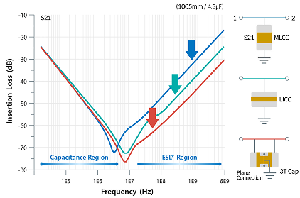 → Low ESL(Reverse Type もしくは 3T)製品使用時の ESL 領域のインピーダンス抑制! |