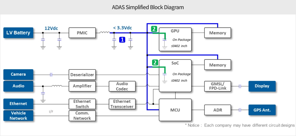 ADAS SoC의 고성능화로 고전력/고주파 환경에서 SoC의 안정적인 동작을 위한 고용량 뿐만 아니라 Low ESL 특성을 갖는 MLCC Needs도 지속적으로 증가하고 있습니다. SoC의 Switching frequency가 높아짐에 따라 루프 인덕턴스로 인한 고주파 노이즈가 발생하게 되며, 이러한 고주파 노이즈를 억제하기 위해 MLCC를 사용하게 됩니다.