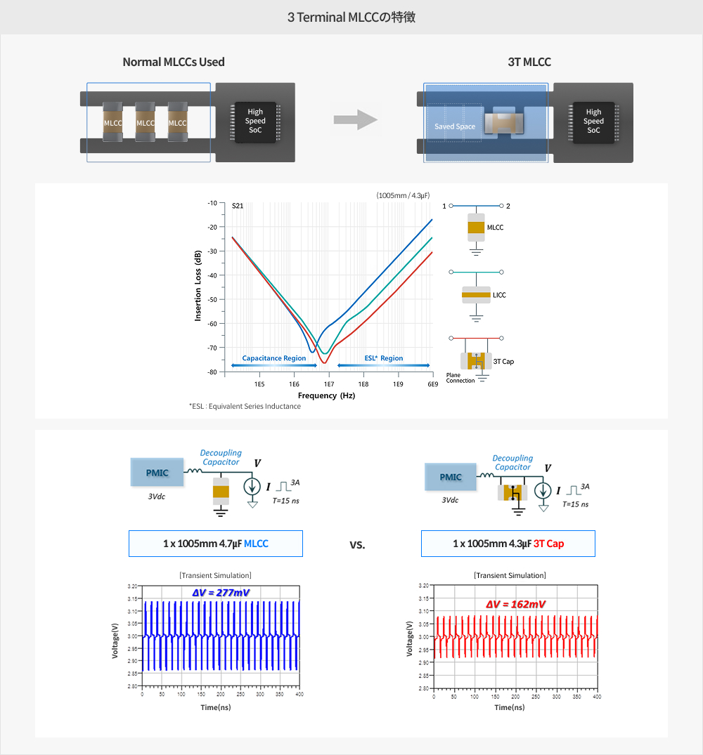 低 ESL(3T) MLCCは本アプリケーションが要求される電気的特性を満たしつつ、スペース節約において30%以上の削減効果が期待できます。